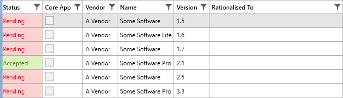 - Auto-rationalise all lower versions of "A Vendor Some Software" application (including the "Lite" and "Pro" editions) up to the highest Accepted version (2.1) because the Higher Threshold is set to *.*.*.* which